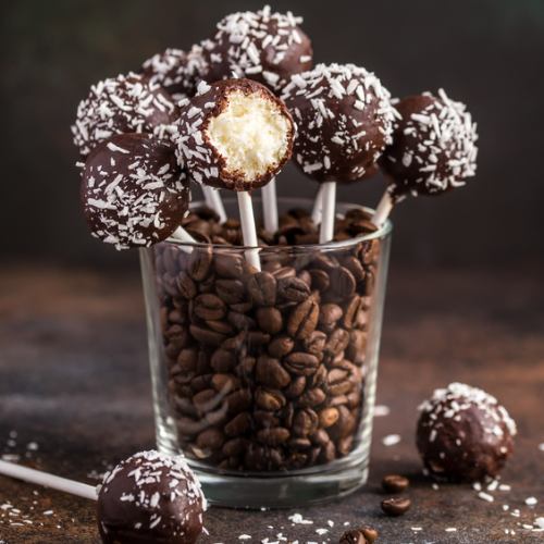 - Tauche dann die Cake Pops in die Schokolade und ziehe sie direkt durch die Kokosraspel. Lasse die Schokolade vor dem Verzehr aushärten.