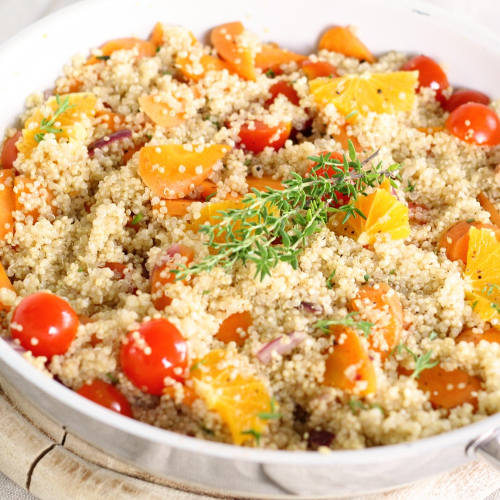 Couscous ist nicht nur eine fantastische pflanzliche Eiweißquelle, sondern steckt zudem voller wichtiger Mineral- und Ballaststoffe, die der Körper braucht. Kombiniert mit dem leckeren Saft einer Orange, wird daraus eine exotische Power-Mahlzeit mit unvergleichlichem Geschmack.