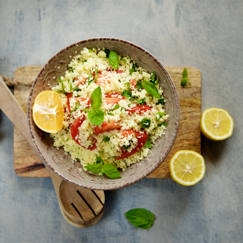Couscous ist nicht nur eine ausgezeichnete Kohlenhydratquelle, sondern zudem fettarm und reich an wertvollen Spurenelementen wie Magnesium, Kalium und Eisen. Zubereitet als leckerer Salat, ergibt Couscous eine gesunde und sättigende Mahlzeit am Abend.