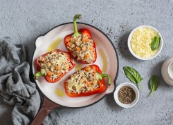 Wer es jedoch tatsächlich etwas eilig hat, kann die Füllung bereits am Vortag vorbereiten und muss die Paprika am nächsten Tag nur noch befüllen und in den Ofen schieben.