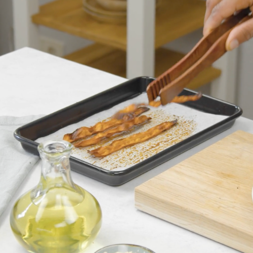 - Hole den Karotten-Bacon aus dem Ofen, lasse ihn etwas abkühlen und schon ist er servierfertig.
