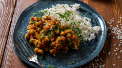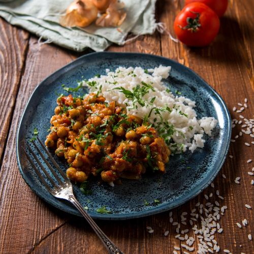 - Serviere das Kichererbsen-Curry mit dem fertigen Basmatireis.