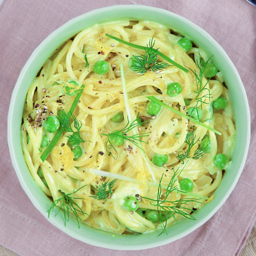 - Hebe zuletzt die Erbsen, die Frühlingszwiebel und den Dill unter die Spaghetti.