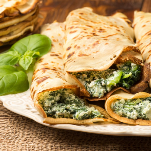 - Fülle die Pfannkuchen mit der Spinat-Feta-Füllung, rolle sie zusammen und lasse sie dir schmecken!