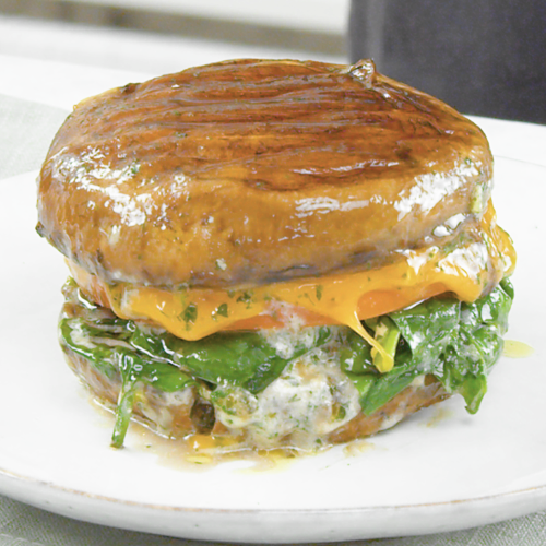 Burger ohne Brot? Das geht! In diesem Rezept ersetzen wir Burgerbrötchen durch leckere Portobellopilze, belegen diese mit sorgfältig ausgewählten Zutaten und grillen das Ganze im Sandwichmaker. Ein schneller und fleischloser Snack mit 100 % Geschmack!