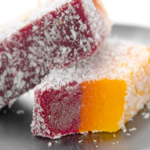 - Stürze die Auflaufform, entferne das Backpapier und schneide das zweifarbige, fest gewordene Püree in gleich große Stücke. Wälze die Stücke in Kokosraspeln.
