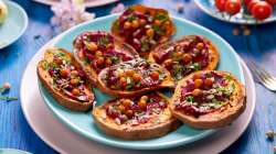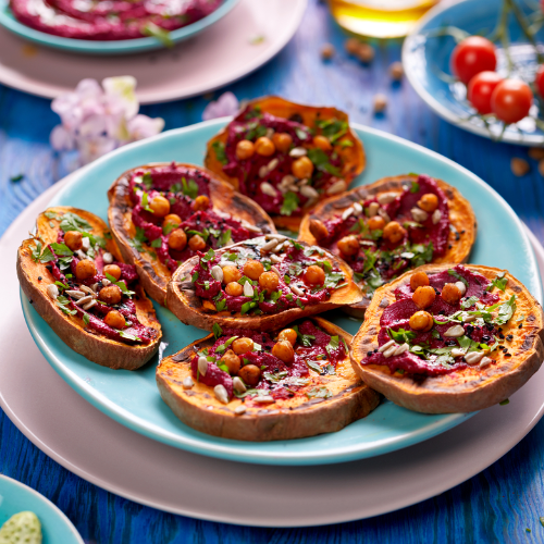 • Nimm die fertigen Süßkartoffelscheiben aus dem Ofen und lasse sie kurz abkühlen. Bestreiche sie anschließend mit dem Rote-Bete-Aufstrich und belege sie mit den Kichererbsen.