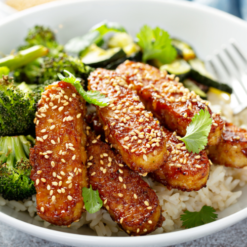 Tempeh-Teriyaki-Bowl mit Brokkoli und Reis