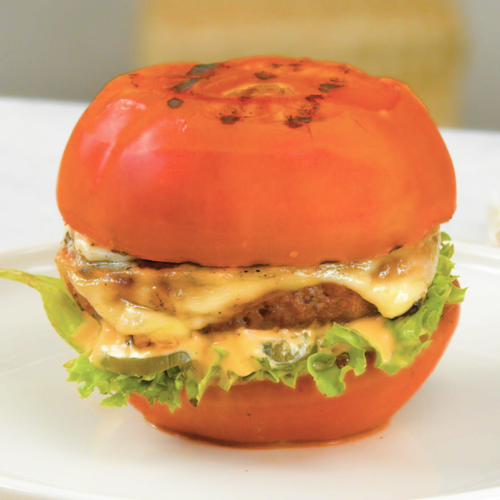 - Belege die obere Hälfte der Tomate mit einer Scheibe Käse. Forme das vegane Hack zu einem Burgerpatty und lege es auf den Käse drauf.