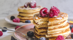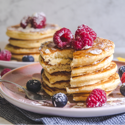 - Bestreue die fertigen Pancakes mit etwas Puderzucker und serviere sie mit frischen Beeren.
