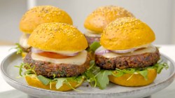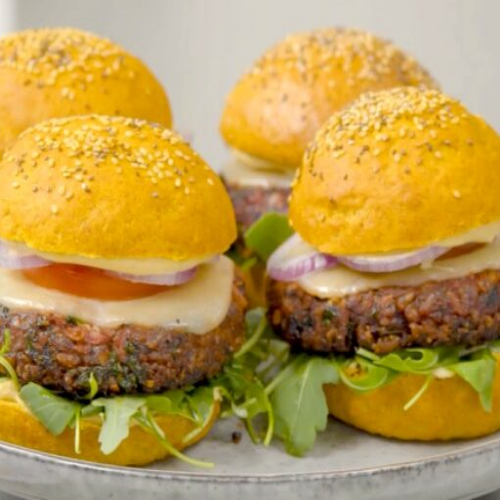 - Püriere die Zutaten für die vegane Mayonnaise. Bestreiche mit ihr dann die aufgeschnittenen Brioche-Brötchen. Belege diese nun mit dem Rucola, den mit veganem Käse überbackenen Rote-Bete-Pattys sowie Tomaten und Zwiebelringen.