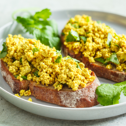 - Verteile das vegane Rührei auf vier Scheiben Sauerteigbrot und gib etwas frischen Koriander hinzu.