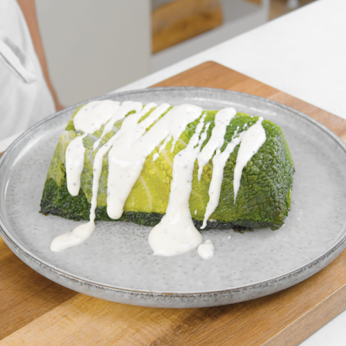 - Gib die Wirsingkohl-Lasagne bei 180 °C Ober- und Unterhitze für 20 Minuten in den Ofen. Stürze die fertige Lasagne auf einen Teller und serviere sie mit der restlichen Käsesauce.